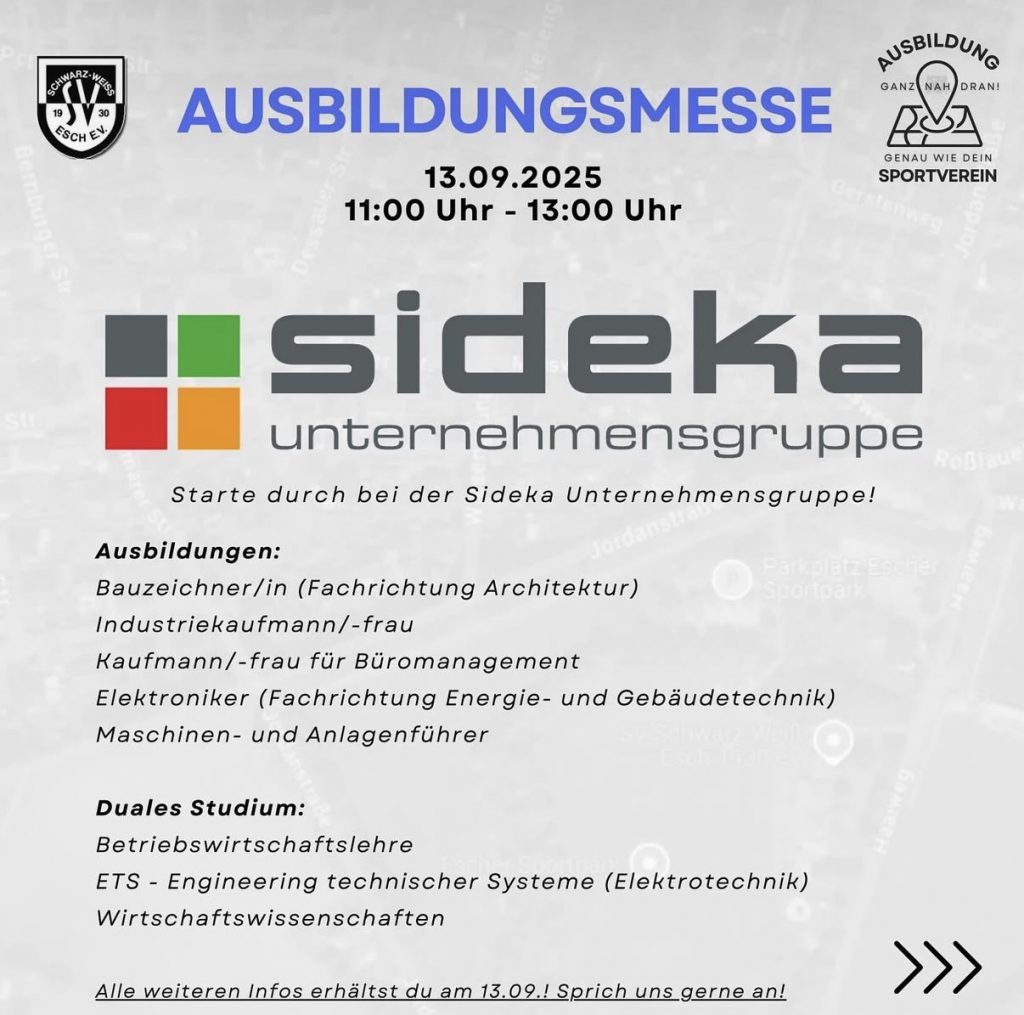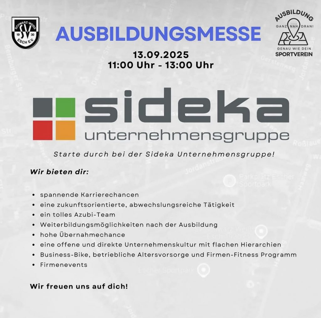 Am Samstag findet im Escher Sportpark von 11:00 – 13:00 Uhr eine Ausbildungsmesse statt. Und natürlich sind wir auch mit dabei 🙂 Wir freuen uns auf viele interessante Gespräche und natürlich darauf, unsere neuen Azubis kennenzulernen 😉