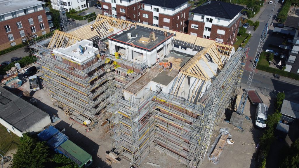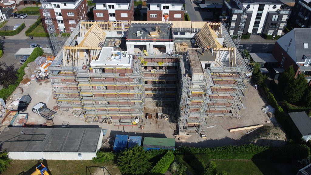 Auch bei unserem Bauvorhaben Basilikastraße – Rheine geht es in großen Schritten voran: Die Rohbauarbeiten sind so gut wie abgeschlossen und auch die Zimmermanns- und Dachdeckerarbeiten stehen kurz vor der Fertigstellung. Das bedeutet, dass es bald losgehen kann mit der Fenstermontage, dem Trockenbau sowie der Rohbauinstallationen von Elektro und der Heizungs-, Sanitär- und Lüftungsanlagen 💪
